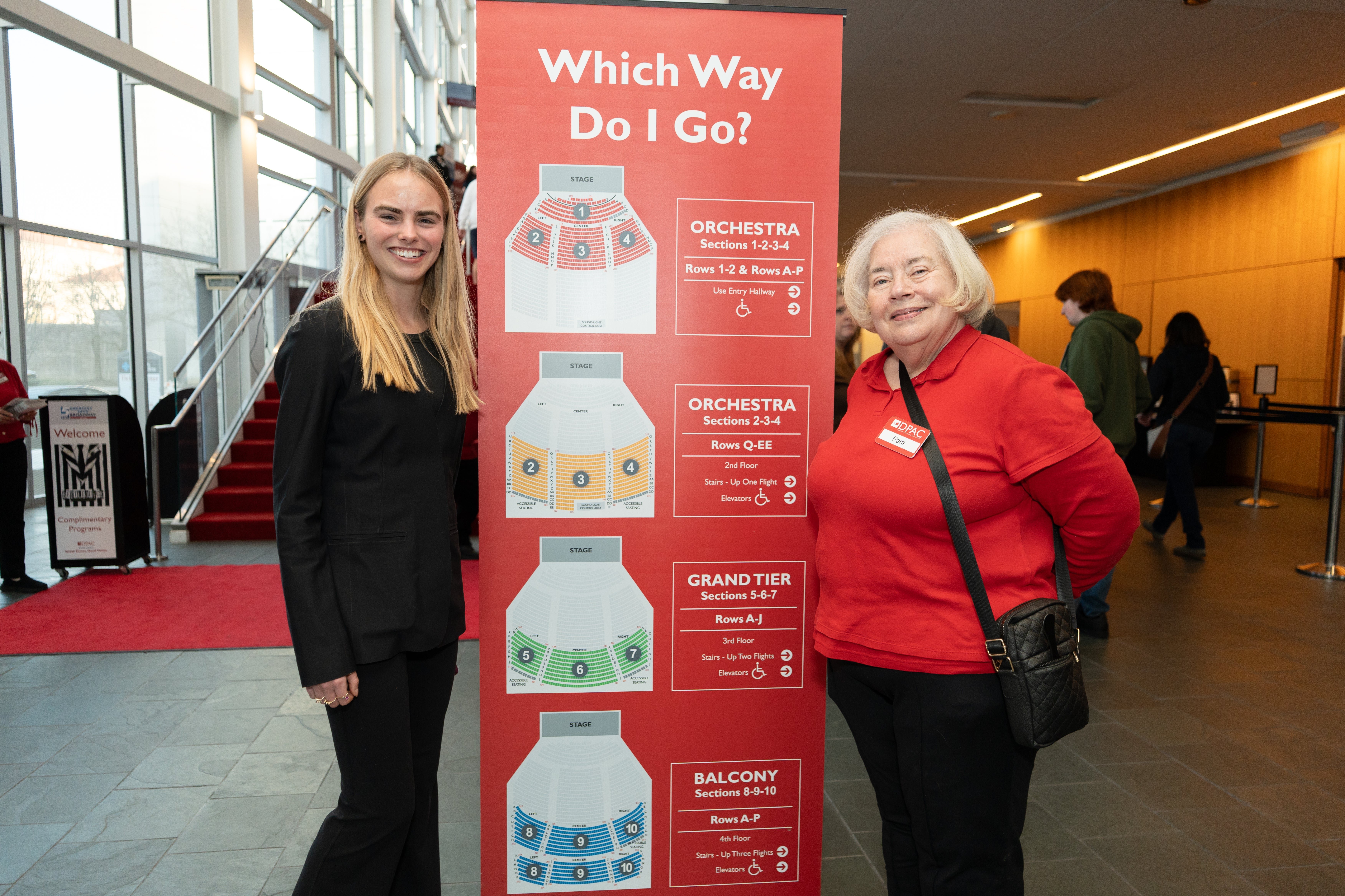 When arriving for an event at DPAC, guests are welcomed by members of the Durham Wayfinders. Wayfinders help guests navigate from the nearby parking areas, distribute Broadway programs, and welcome guests at DPAC’s entry doors and entry lobby areas. This group of almost 250 are part of a City of Durham volunteer program where members share their time and talents in the spirit of helping everyone feel welcome at DPAC.
